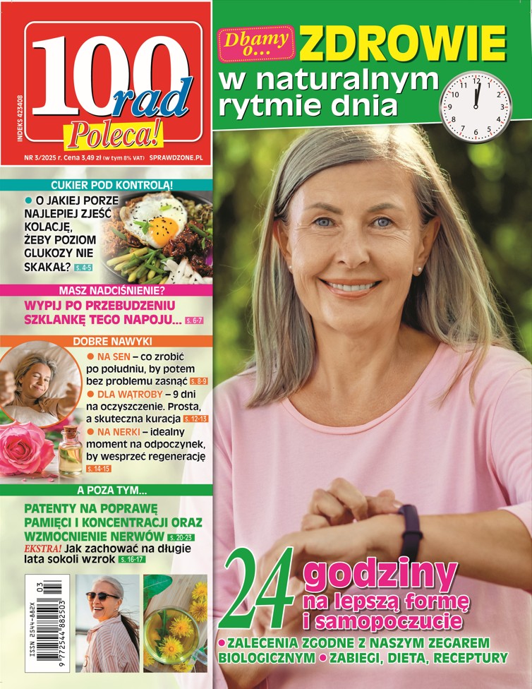 Magazyn zawiera sprawdzone informacje, kiedy najlepiej jeść kolację, by ustabilizować poziom glukozy, co pić tuż po przebudzeniu przy nadciśnieniu oraz jak wspierać regenerację organizmu prostymi, codziennymi nawykami, jak łagodzić bóle reumatyczne naturalnymi metodami, co robić, by poprawić pamięć i koncentrację, oraz jak chronić wzrok, by jak najdłużej cieszyć się jego ostrością.