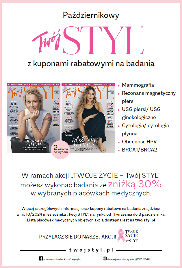 Kupony uprawniające do skorzystania ze zniżek w placówkach medycznych dostępne są w numerze 10 miesięcznika „Twój Styl”, który trafił do sprzedaży 11 września! Szczegółowy spis placówek uczestniczących w akcji i oferowanych przez nie badań w promocyjnej cenie dostępny jest na stronie internetowej twojstyl.pl.