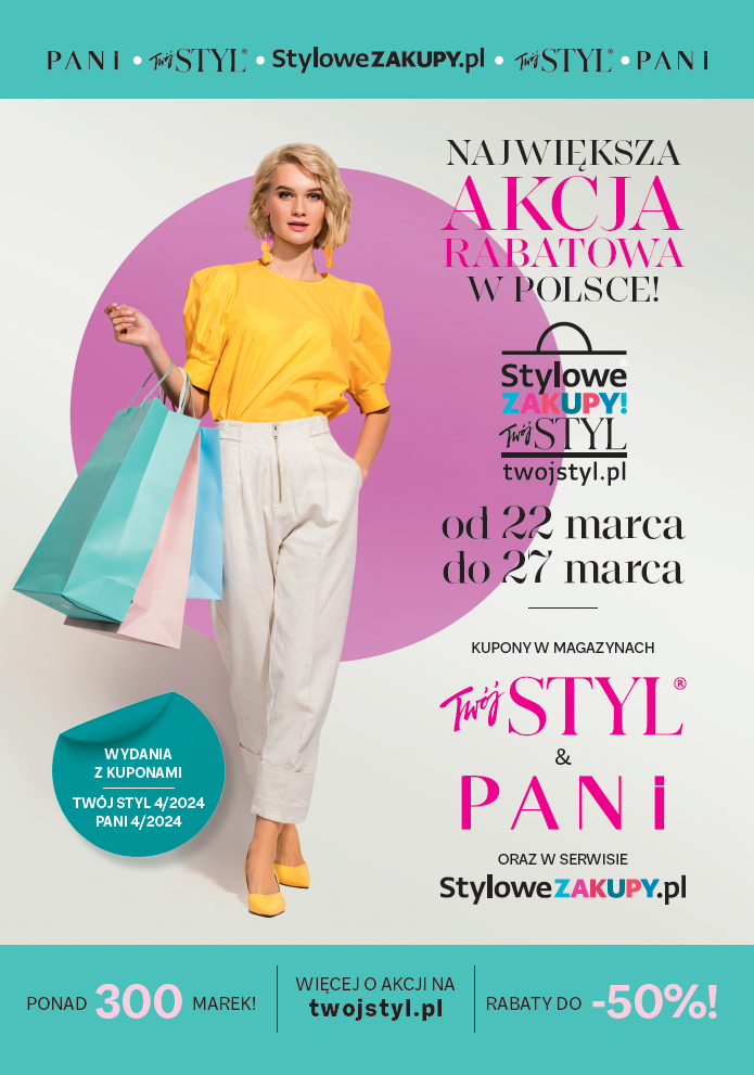 W kwietniowych wydaniach „Twojego Stylu” (w sprzedaży od 8 marca) i „Pani” (w sprzedaży od 15 marca), znajdą się kupony rabatowe do ponad 300 sklepów, ze zniżkami aż do 50%.  Ta największa tego typu akcja rabatowa w Polsce potrwa 6 dni, od 22 marca do 27 marca w sklepach stacjonarnych, punktach usługowych w całej Polsce oraz sklepach online. Można będzie również pobrać e-wydanie „Twojego Stylu” i „Pani” na portalu www.czytelnia.pl i skorzystać z atrakcyjnych zniżek.