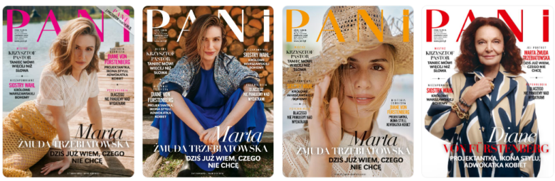 Czerwcowy numer „PANI” pojawi się na rynku 15 maja. Czytelniczki dostają do wyboru magazyn z aż czterema okładkami, w tym jednen w cenie promocyjnej, z dodatkiem – maską do włosów marki Jantar. Bohaterką trzech okładek jest aktorka Marta Żmuda-Trzebiatowska, która w bardzo szczerej rozmowie opowiada o macierzyństwie, małżeństwie i o tym, jak pokonała wypalenie zawodowe. Gwiazdą czwartej okładki jest Diane von Fürstenberg – projektantka mody, która stworzyła kultową sukienkę kopertową, muza Andy’ego Warhola, była żona niemieckiego księcia. Właścicielka marki DVF udzieliła ekskluzywnego wywiadu, w którym dzieli się swym doświadczeniem, wspomina, ale też śmiało patrzy w przyszłość.