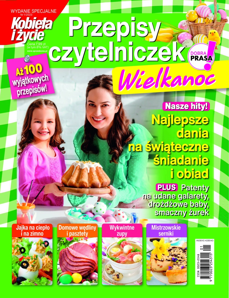 23 lutego ukaże się wydanie specjalne miesięcznika „Kobieta i Życie” – „Przepisy czytelniczek. Wielkanoc”. W piśmie znaleźć można będzie 100 najlepszych przepisów na wyjątkowe świąteczne potrawy, wybrane spośród sprawdzonych receptur nadesłanych do redakcji przez czytelniczki „Kobiety i Życia”. Będą wśród nich pomysły na uroczyste śniadanie, tradycyjne specjały z jajek na ciepło i zimno, świąteczne przystawki i sałatki, domowe wędliny i pasztety oraz wykwintne zupy na wielkanocny obiad, soczyste i kruche mięsa, nadziewany kurczak i doskonałe słodkości – mistrzowskie serniki, babki i babeczki z bakaliami, czekoladą i lukrem, mazurki oraz wiosenne biszkoptowe i bezowe torty.