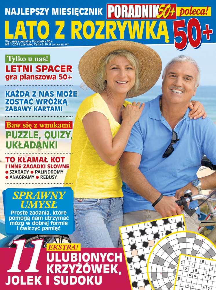 29 czerwca ukaże się wydanie specjalne miesięcznika „Poradnik 50+” „Lato z rozrywką 50+”. Czytelnicy znajdą w nim nie tylko tradycyjne krzyżówki, jolki czy sudoku, ale również mnóstwo innych rozrywek umysłowych, które pozwolą ćwiczyć pamięć i utrzymać mózg w dobrej kondycji. Redakcja poleca w szczególności zagadki słowne i rysunkowe, quizy i wykreślanki oraz relaksujące kolorowanki dla dorosłych.