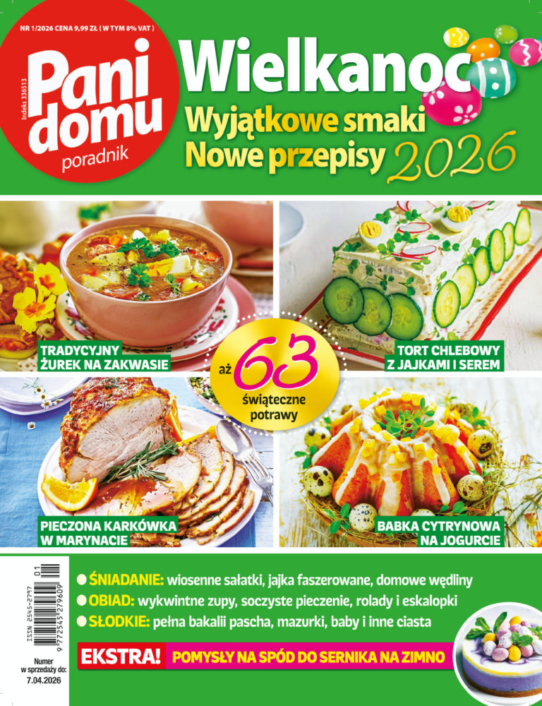 W magazynie czytelnicy znajdą aż 63 tradycyjne przepisy na świąteczne potrawy, a wśród nich: wielkanocne śniadanie – jajka faszerowane, domowe wędliny, biała kiełbasa, pasztety i terriny oraz żurek na zakwasie, uroczysty obiad –zupy, soczyste pieczenie, rolady i eskalopki i oczywiście świąteczne słodkości – puszyste baby, kolorowe mazurki, pascha z bakaliami i inne desery, a dodatkowo pomysły na: pyszne, pożywne sałatki, sosy do mięs oraz spody do serników na zimno.
