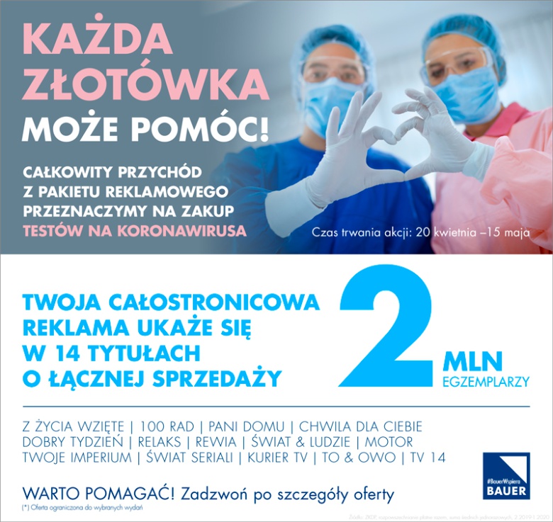 Biuro Reklamy Wydawnictwa przygotowało specjalną ofertę reklamową w 14 tytułach. Klienci, którzy wykupią reklamy we wskazanych wydaniach czasopism w okresie od 20 kwietnia do 15 maja otrzymają preferencyjną cenę, a całkowity przychód z tego pakietu reklamowego Bauer przeznaczy na zakup testów na koronawirusa we współpracy z firmą Warsaw Genomics.